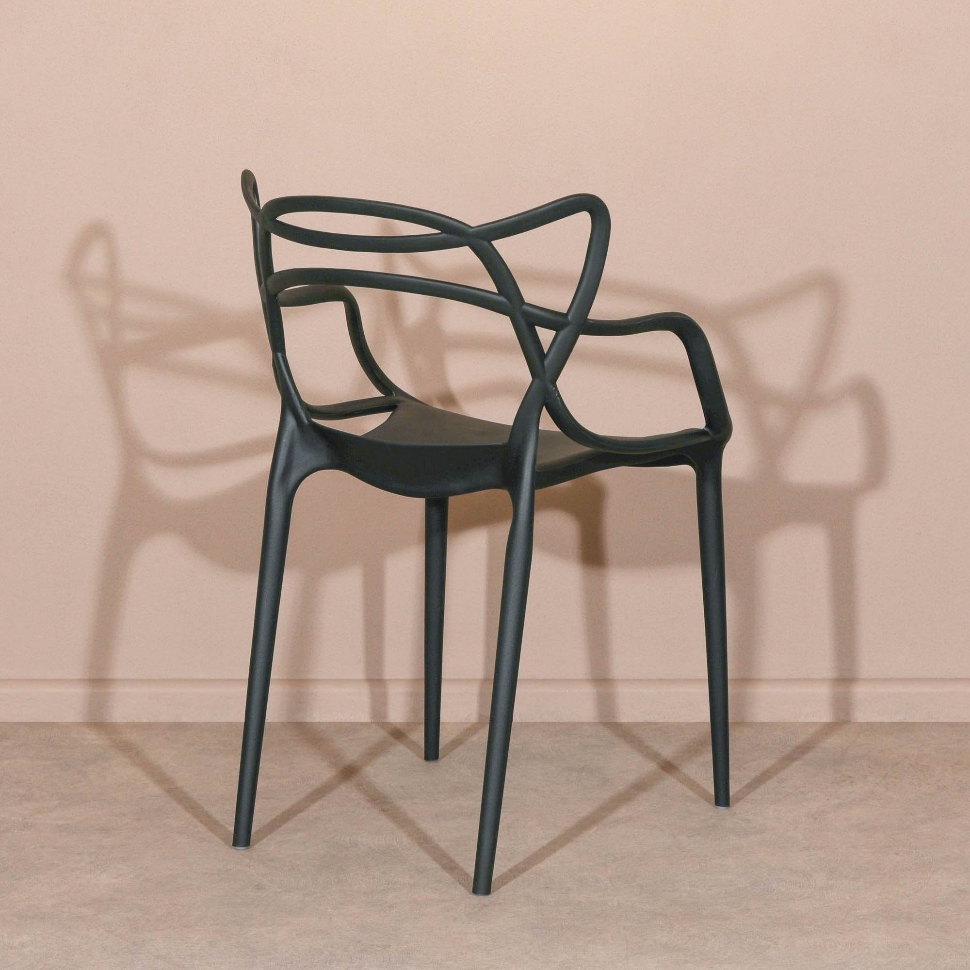 The black finish takes this modern design to new heights. Sleek, bold, and effortlessly stylish, the Black Masters Chair seamlessly blends into a wide range of interior themes—from minimalist Scandinavian dining rooms to eclectic industrial lofts. Its timeless colour allows the sculptural curves to pop, making it a bold statement piece in any environment.