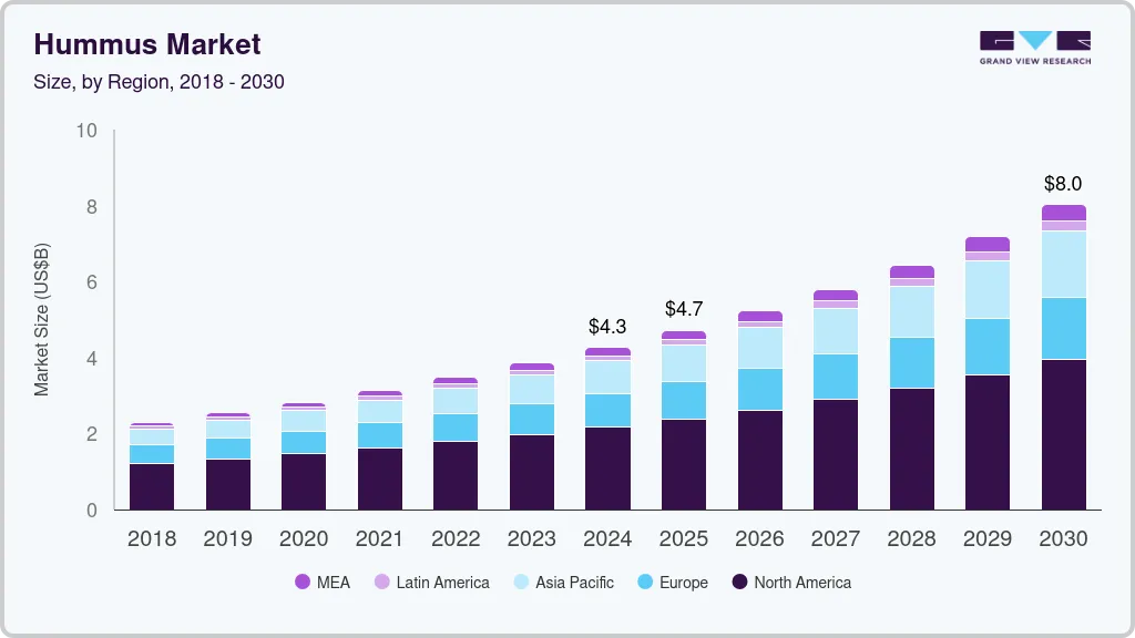 The global hummus market was valued at USD 4.26 billion in 2024 and is projected to reach USD 8.03 billion by 2030, growing at a CAGR of 11.1% from 2025 to 2030. The market’s growth is fueled by changing consumer preferences and lifestyle trends, particularly the shift toward nutritious, plant-based foods.