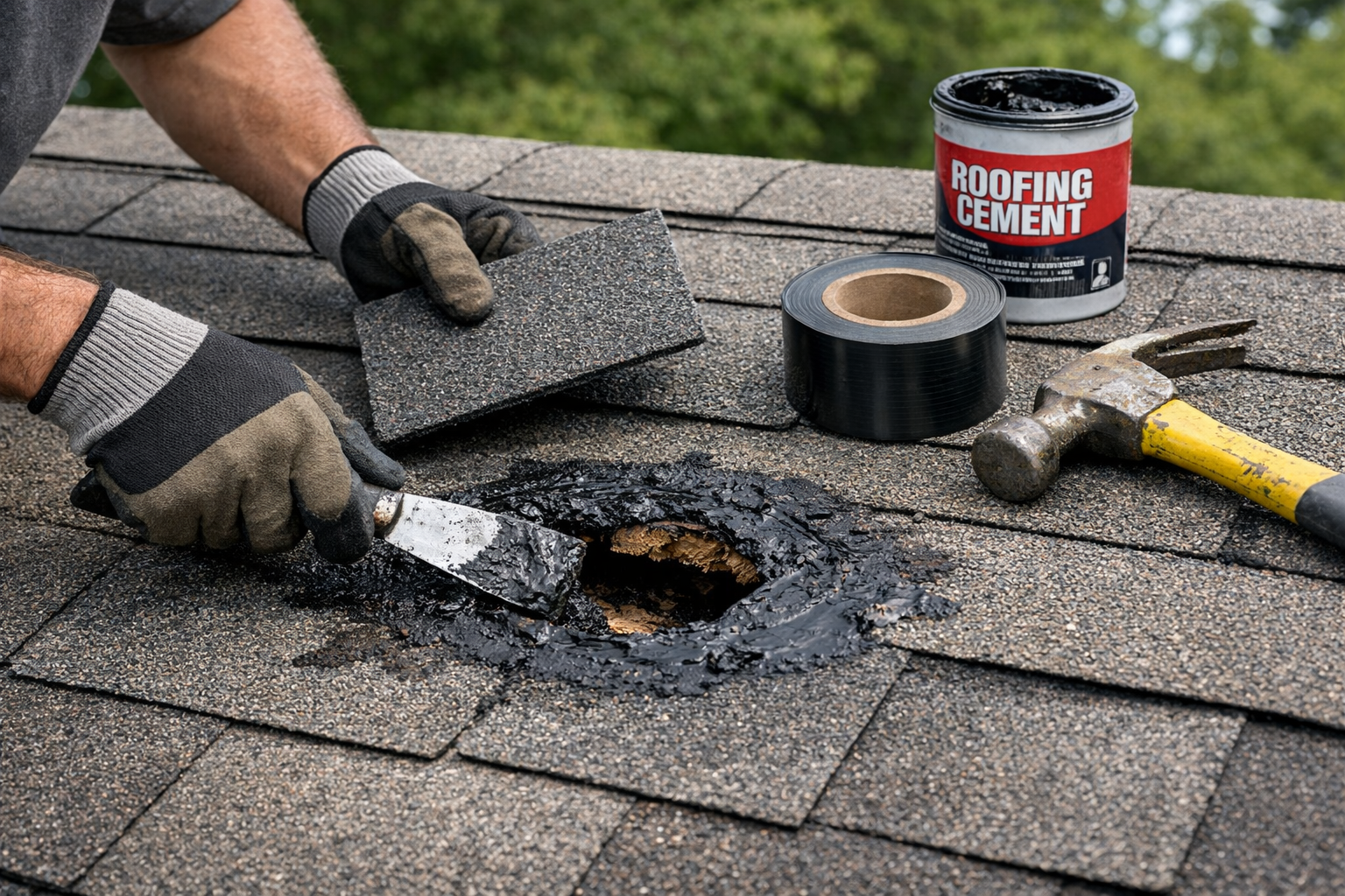 This method won’t replace shingles long-term, but it’s a reliable short-term how to patch a hole in roof solution.