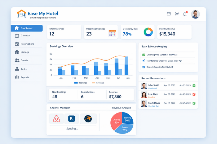 Ease My Hotel is a powerful hospitality technology platform built to simplify the complexities of short-term rental management. Designed for modern hosts, it provides a complete ecosystem that supports property growth, automation, and revenue optimization.