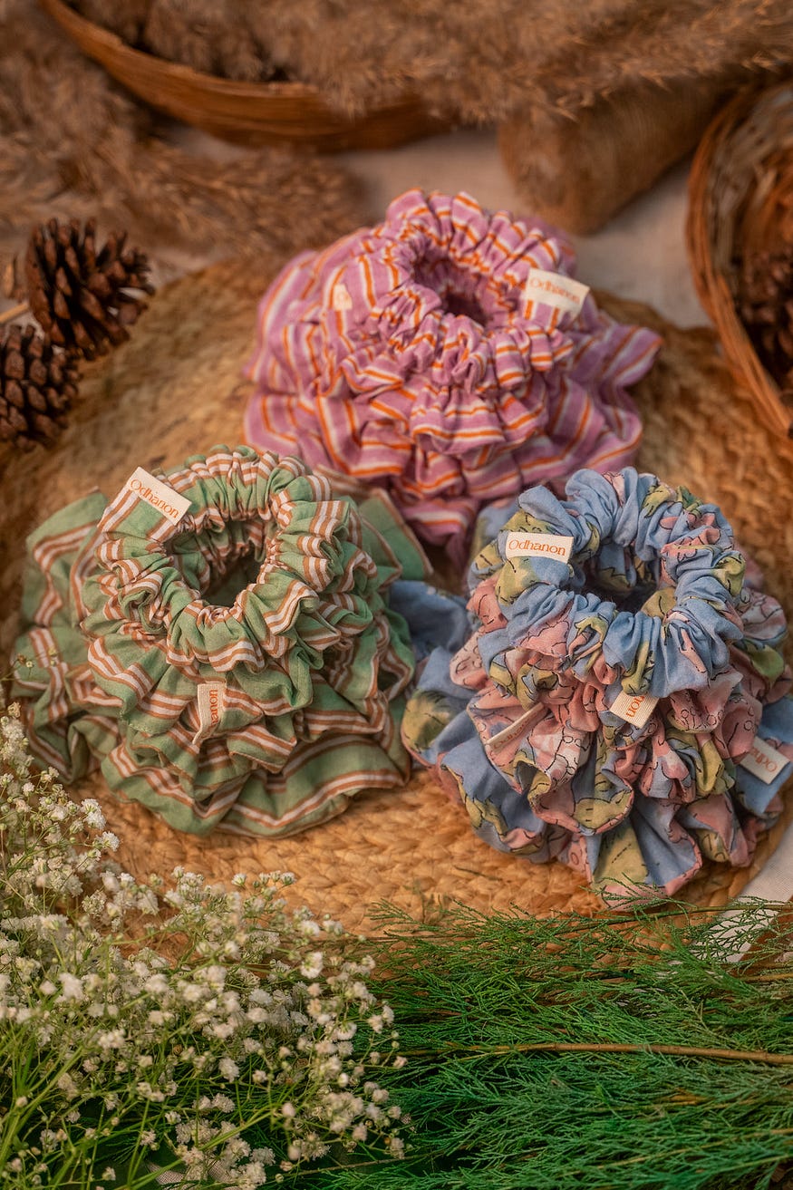 Satin, velvet, and printed scrunchies complement winter textures beautifully. Match them with your co-ord set or dress for a coordinated winter look.